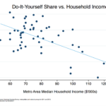 At the national level, residential remodeling and maintenance are positively correlated with existing home sales. The next chart plots the number of existing home sales against the BuildZoom & Urban Economics Lab Index, which tracks residential remodeling and maintenance activity. Of course, the correlation on its own does not imply causation. For instance, if people’s prospects were brighter before the Great Recession and, as a result, they were more willing and able to take on debt, this could have led to the higher levels that we see of both home sales and remodeling, even if the former wasn’t actually driving the latter. However, juxtaposing the chart with the earlier evidence regarding the timing of remodeling and maintenance vis-a-vis sales leaves little room for doubt that home sales were, in fact, responsible for generating some amount of construction activity.